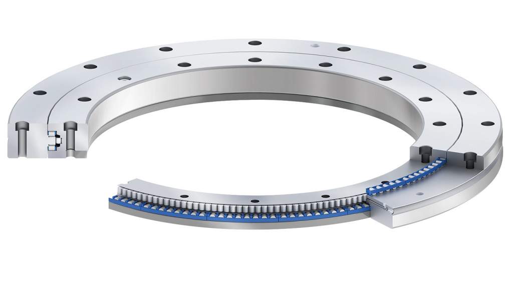 AXRY-NGS-Lager sind zweiseitig wirkende, anschraubbare und einbaufertige Präzisionslagereinheiten für hochsteife und gleichzeitig schnell drehende Anwendungen, beispielsweise für Fräsdrehtische oder Vertikaldrehmaschinen. Das Lager nimmt spielfrei Axial- und Radialkräfte sowie Kipp-Momente auf.