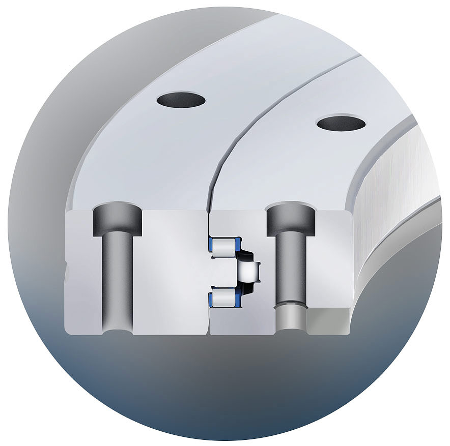 AXRY-EX Lager sind zweiseitig wirkende, anschraubbare und einbaufertige Präzisionslagereinheiten für hochsteife Anwendungen, beispielsweise Rundtische oder Fräsköpfe. Das Lager nimmt spielfrei sowohl beidseitig Axial- und Radialkräfte als auch Kippmomente auf. AXRY-EX Lager sind für Fett- und Ölschmierung geeignet und auf maximale Steifigkeit ausgelegt.